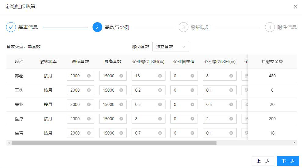 要预先设置好保险政策,为服务专员在服务管理页面增员时做准备,在输入增员缴交基数后,系统自动能计算出要缴纳的社保金额
