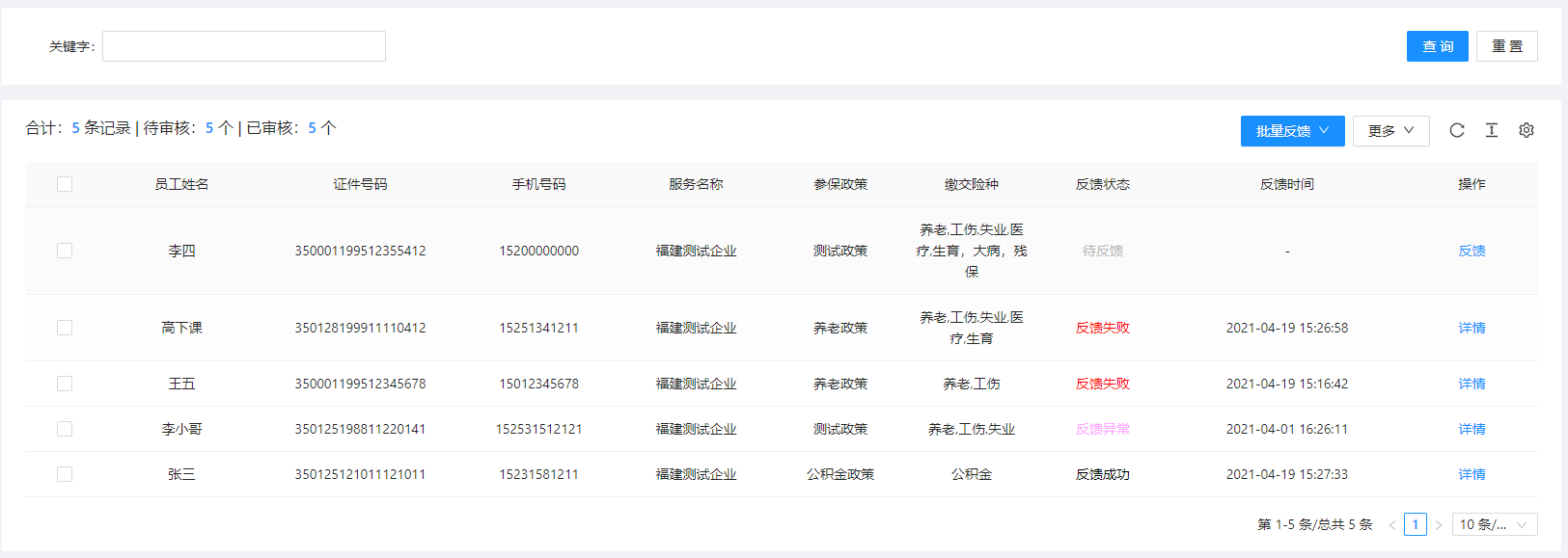 社保专员在保险管理页面,对服务专员提交的增减员信息进行反馈,将反馈的结果通知到服务专员,确认社保公积金缴交无误